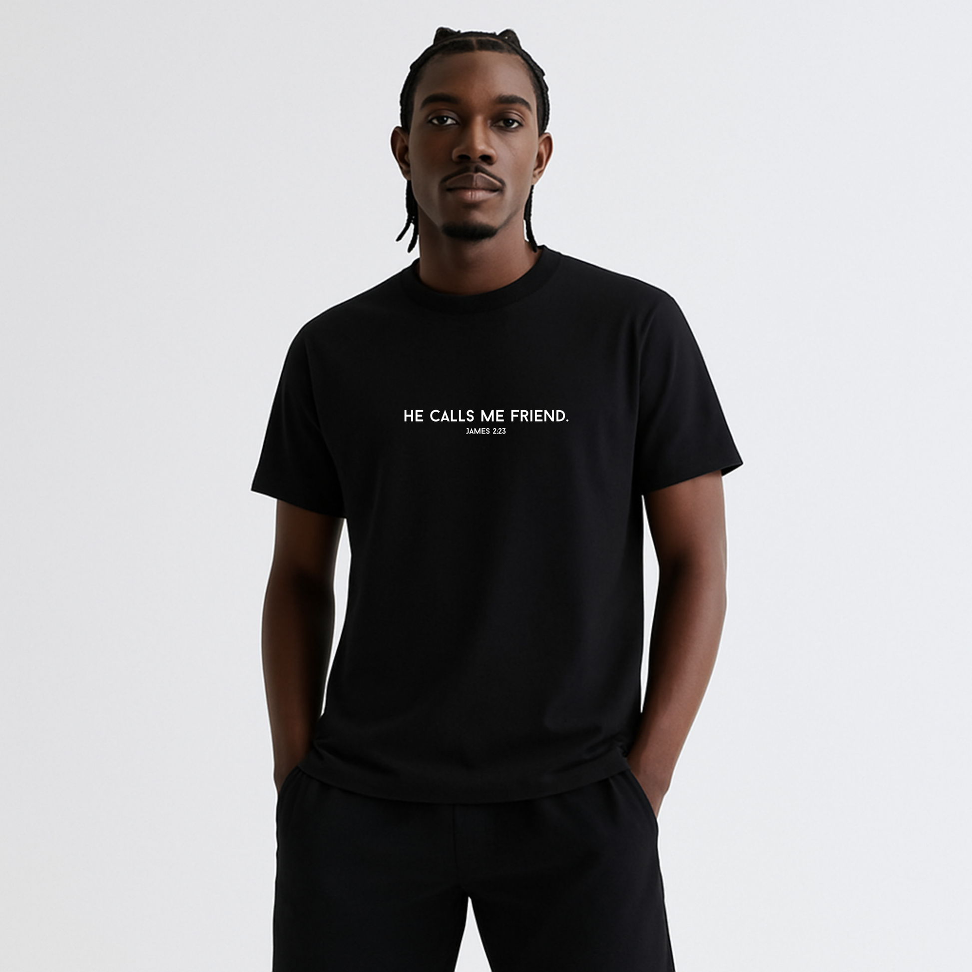 “HE CALLS ME FRIEND.” printed in crisp white lettering