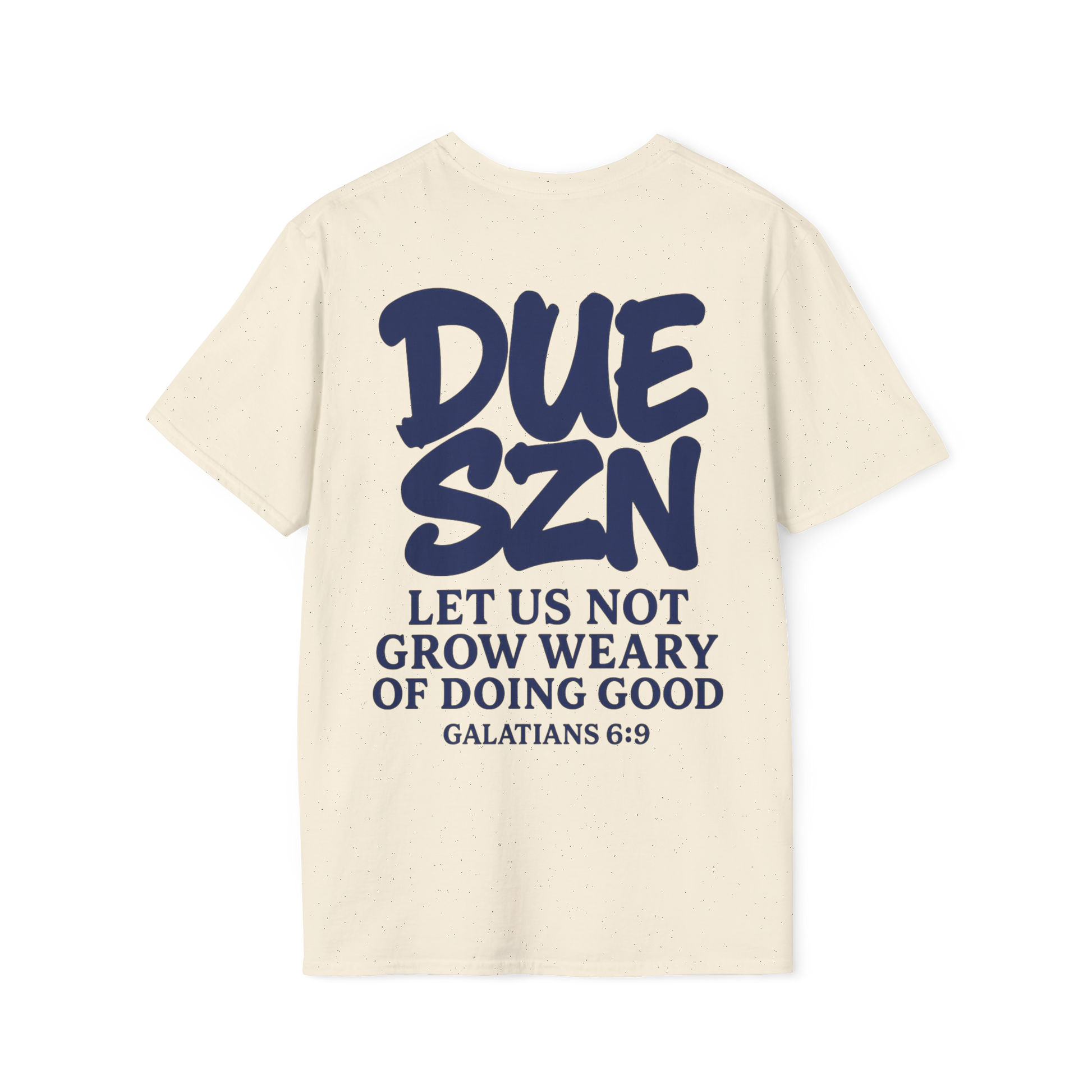 Step into your season with bold faith with the DUE SZN T-Shirt. This tee serves as a declaration of faith, combining urban streetwear with powerful scripture from Galatians 6:9. The oversized lettering and vibrant detailing make it stand out, while the verse grounds it in timeless truth. Wear it as a daily encouragement that your harvest is on the way. Relevant for those seeking faith-driven apparel for daily wear or special occasions.
